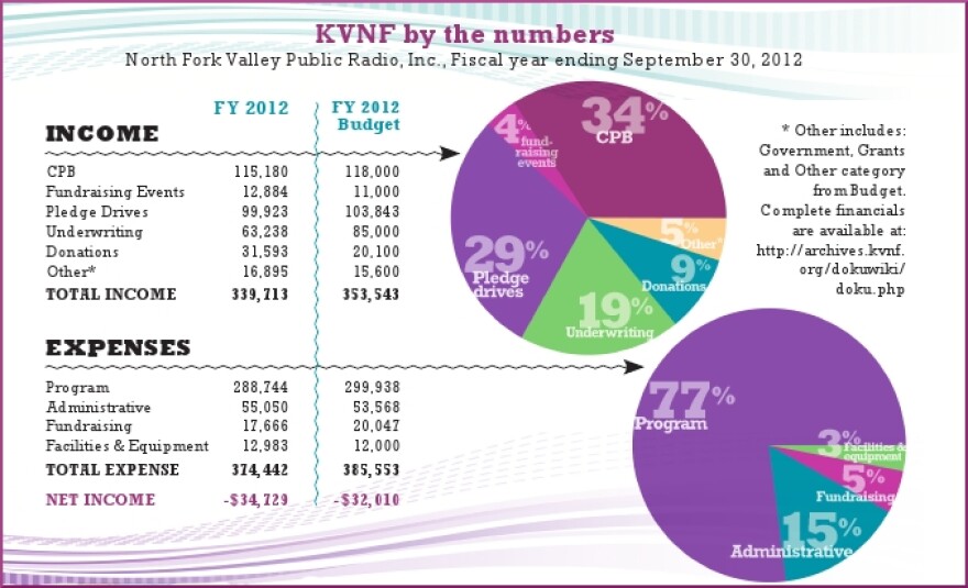 Like the world around us, public media is called to respond to the shifting sands of rapid change. At KVNF, that change has involved a digital revolution in the way we deliver our programming and a very real challenge to our funding model as we prepare for the long haul of a slow economy and a federal budget process in crisis. We started tightening our belts in 2008, but by the close of the 2012 fiscal year, we had to draw on our reserve funds in an effort to continue providing the service that we all value.