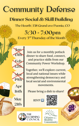 Join us to share food, connect, and practice skills from our Community Power Workshop. Together we’ll explore current local and national issues while strengthening democracy and local social and environmental movements.