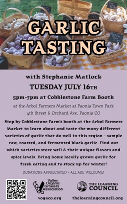 Stop by Cobblestone Farm's booth at the Arbol Farmers Market to learn about and taste the many different varieties of garlic that do well in this region - sample raw, roasted, and fermented black garlic. Find out which varieties store well and their unique flavors and spice levels. Bring home locally grown garlic for fresh eating and to stock up for winter!