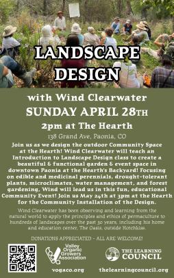 Join us as we design the outdoor Community Space at the Hearth! Wind Clearwater will teach an Introduction to Landscape Design class to create a beautiful & functional garden & event space in downtown Paonia at the Hearth's Backyard! Focusing on edible and medicinal perennials, drought-tolerant plants, microclimates, water management, and forest gardening, Wind will lead us in this fun, educational Community Event!