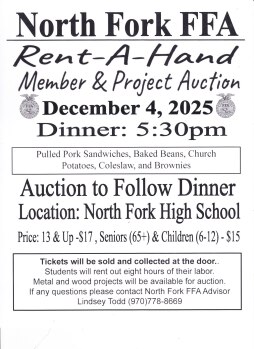 The price to attend this fundraising event is $17 for adults, $15 for children and senior citizens. It will be held at the Noth Fork High School in Hotchkiss. To purchase tickets from an FFA student call (307) 699-2146