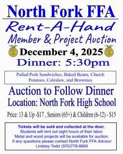 The North Fork FFA Rent-A-Hand auction will be held at 5:30pm at the North Fork Highschool on December 4 ,2025 tickets for dinner for adults $17, for children and seniors $15
