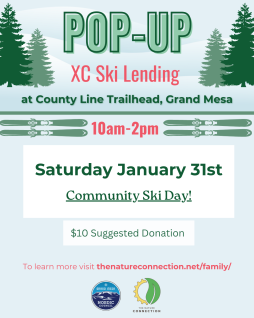 The Nature Connection will be hosting a Pop-Up Cross Country Ski Lending at County Line on the Grand Mesa this upcoming Saturday, January 31st! Bring your family, friends, neighbors, or just yourself to try out cross country skiing on some fresh pow! The Nature Connection will be there from 10 AM to 2PM, giving out skis for a suggested donation of $10, and cannot wait to see you up there! Ski you soon!