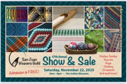 The San Juan Weavers Guild 47th annual Show & Sale is scheduled for Saturday, November 22, 9 a.m. to 4 p.m., at the Ute Indian Museum, 17253 Chipeta Rd., Montrose. The event is free to the public and will feature educational exhibits, demonstrations and hands-on activities. A vast selection of handwoven, handspun, and related fiber items made by guild members will be for sale. The facility is wheelchair-accessible and provides on-site parking.