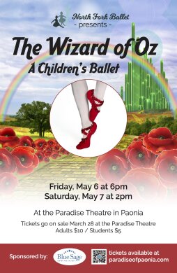 Join Dorothy and friends as they dance their way through the magical land of Oz! This full-length ballet will be performed entirely by students of the North Fork Ballet in Paonia. Everyone is sure to be “swept away” by this new, creative rendition of a timeless classic.