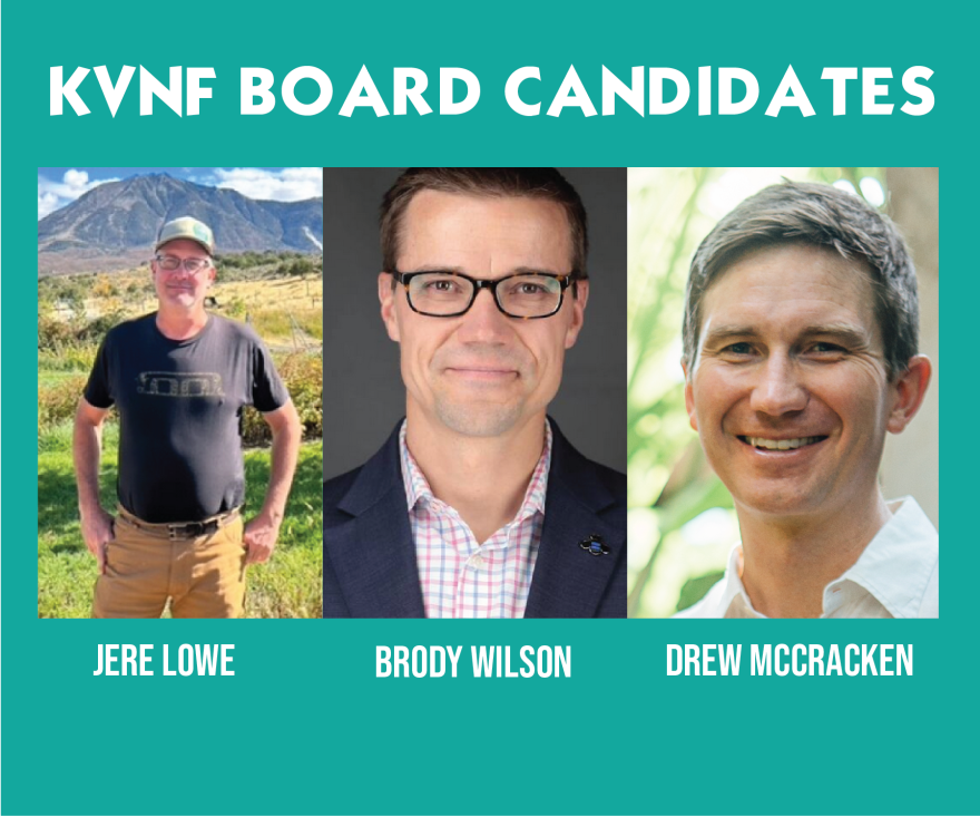 The Annual KVNF Board Meeting is Monday, October 23rd at 5:00 PM at Bill Heddles Recreation Center in Delta. Our three board candidates are Drew McCracken, Brody Wilson and Jere Lowe. KVNF's Cassie Knust and Lisa Young interviewed the three candidates.