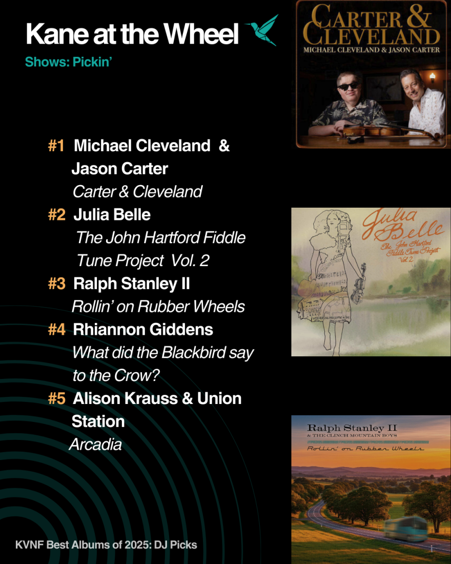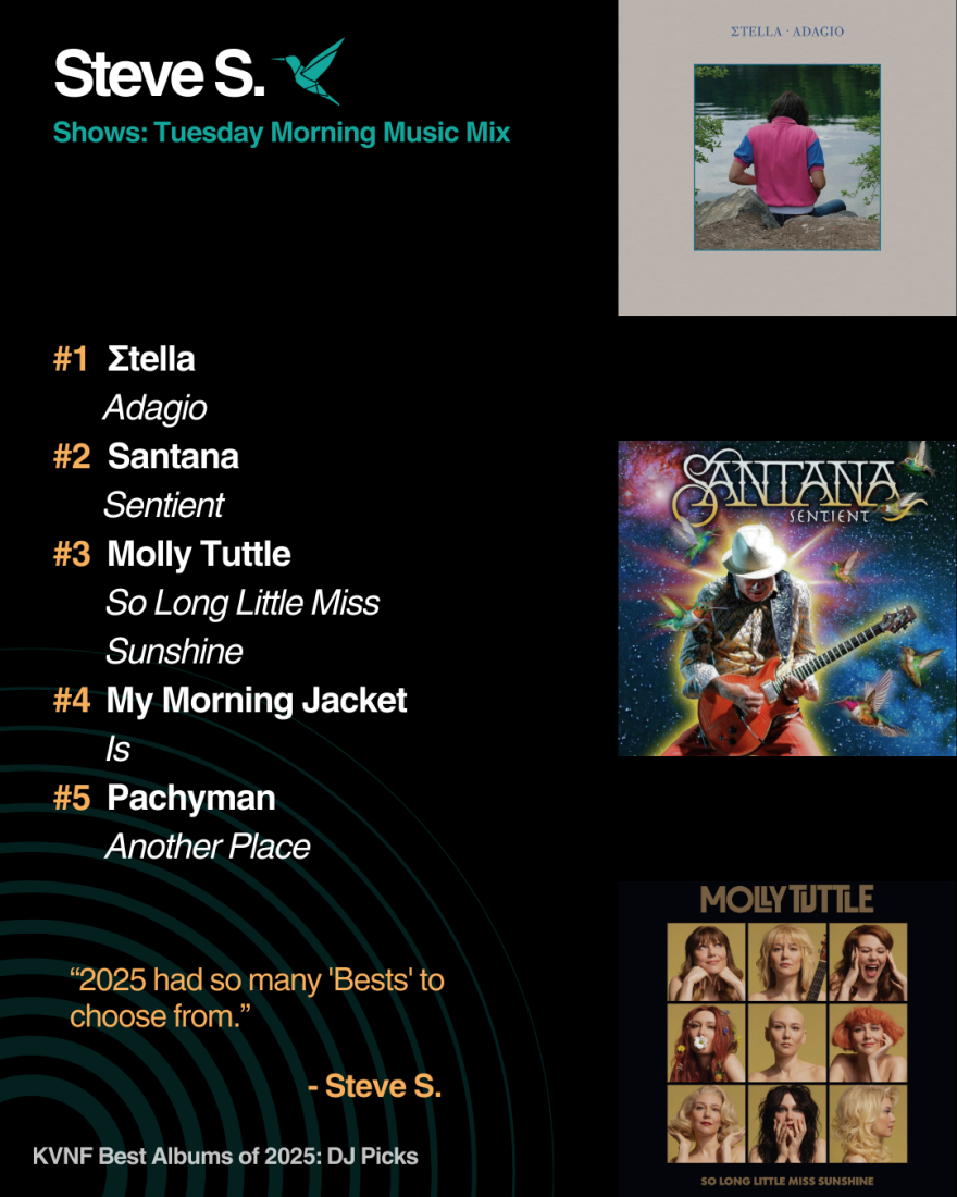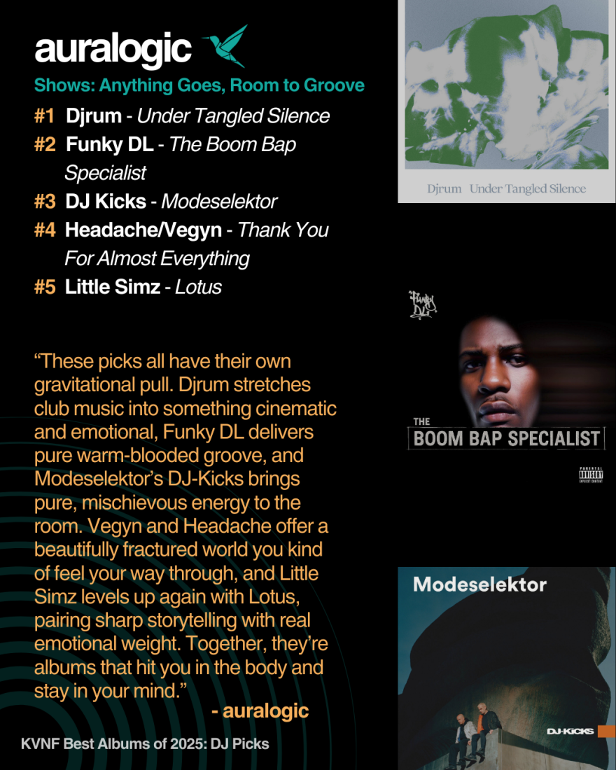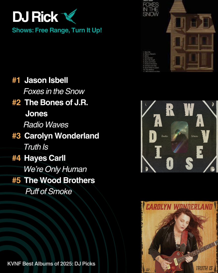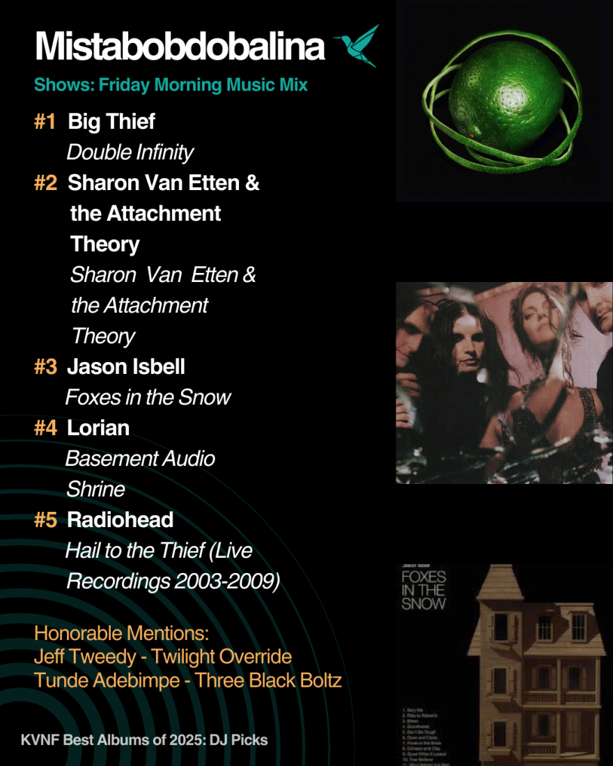 MUSIC New Music KVNF updates their music library periodically spanning every genre. Here, you can dive into KVNF's latest music additions and check out KVNF's Top Spin of the week. Best Albums of 2025: DJ Picks KVNF - Mountain Grown Community Radio | By Andrea Castillo Published December 28, 2025 at 1:18 PM MST Facebook Twitter LinkedIn Email