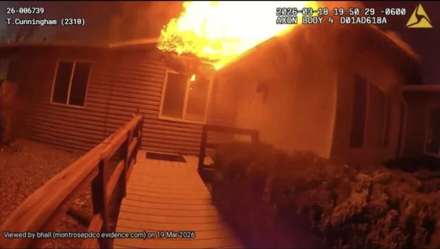 On the night of March 18, Montrose Policy Officers responded to a structure fire on the 1900 Block of White House Drive. Montrose Police Officer Tyler Cunningham arrived on location. He found the backside and roof of a residence had been engulfed in flame. Community residents told Officer Cunningham that an elderly female was trapped inside of the residence. Officer Cunningham made entry into the residence, and located the woman in the bathroom of the residence. He carried the woman out of the residence to EMS personnel waiting in the driveway. Police Chief Blaine Hall commended Officer Cunningham for his quick and decisive action, which Hall said ultimately saved her life. The cause of the fire remains under investigation by the Montrose Police Department and Montrose Fire Protection District investigators.