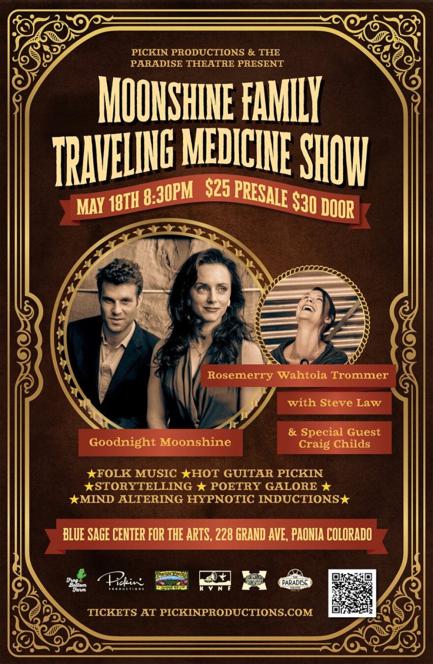 Moonshine Family Traveling Medicine Show featuring Rosemerry Wahtola Trommer with Steve Law and special guest Craig Childs will be Saturday May 18th at 8:30 pm. Tickets and information can be found here.